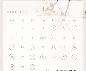 こんにちは!サロンノカルです 4月のご予約可能日です♪ まだまだ寒い日がありますが今から温活や運動をしっかりして汗腺を鍛えておくと 暑い季節に良質な汗を上手にかけるようになって 夏バテや熱中症に負けない身体づくりの手助け […]